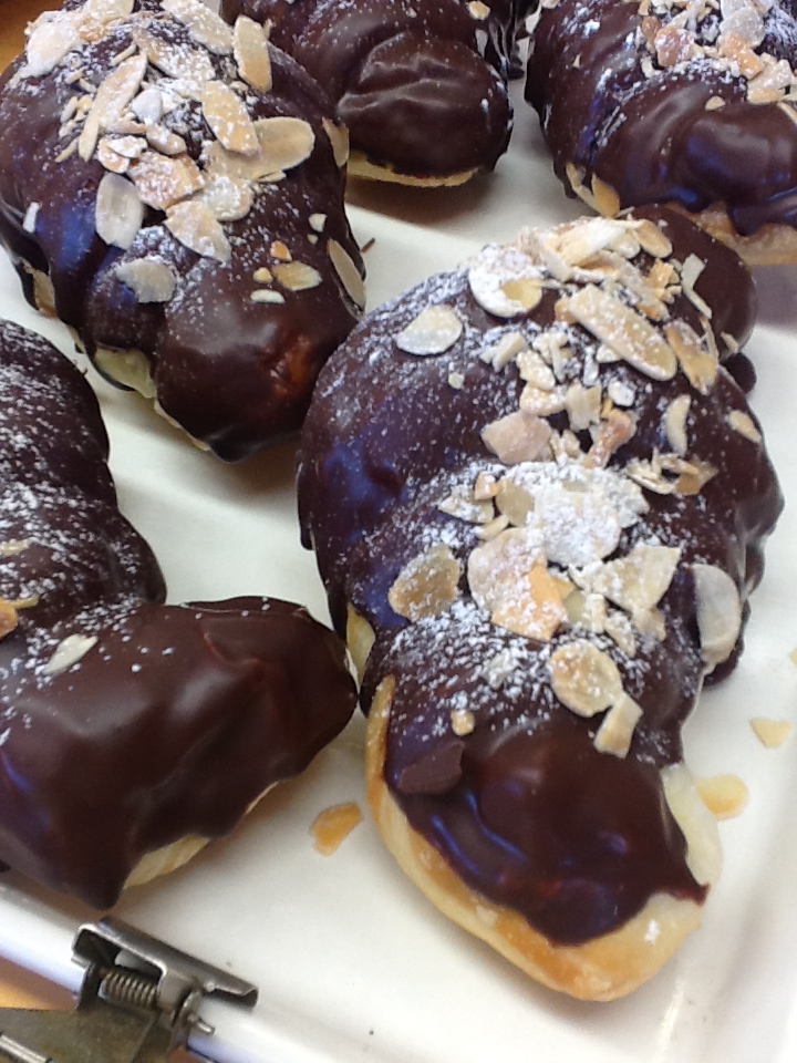 ボリュームのあるクロワッサンにチョコをかけて相性バッチリのアーモンドを乗せてみました。寒い季節。チョコの香りと甘さは嬉しいですね。 |